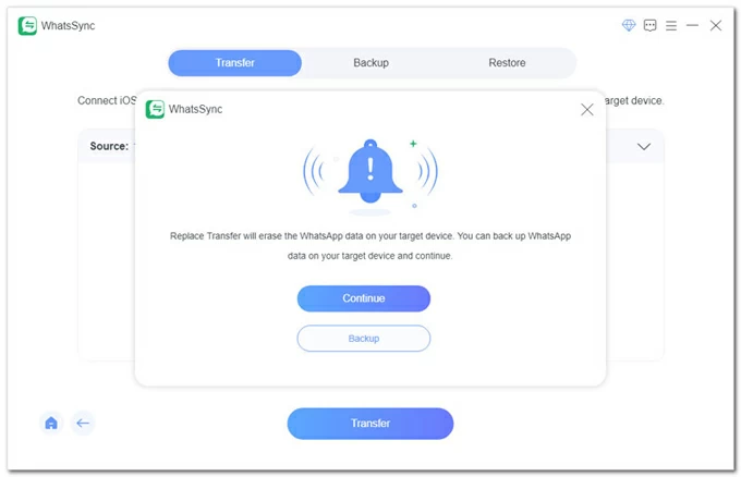 單擊轉移按鈕開始。筆記:傳輸過程將替換目標手機上現有的 WhatsApp 數據。點擊備份如果您想保存單獨的備份,請單擊按鈕。