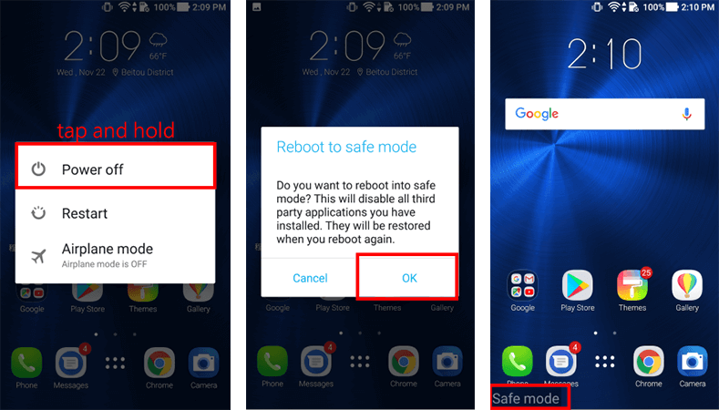 如果您通過第三方應用程序設置鎖定屏幕,而不是使用內置屏幕鎖,則只需啟動到安全模式即可輕鬆解鎖您的 ASUS Zenphone。因此,在安全模式下重新啟動設備會默認禁用設備中的所有第三方應用程序,並且屏幕鎖定設置為僅滑動。