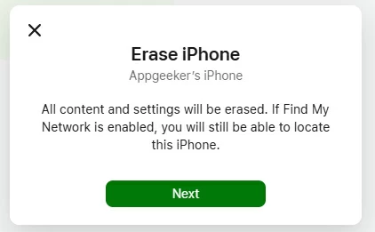 - 要確認,請單擊下一個出現“擦除iPhone”提示時按鈕。提醒您將刪除所有數據。通過擦拭設備清潔,此操作使您可以解鎖iPhone 17密碼。