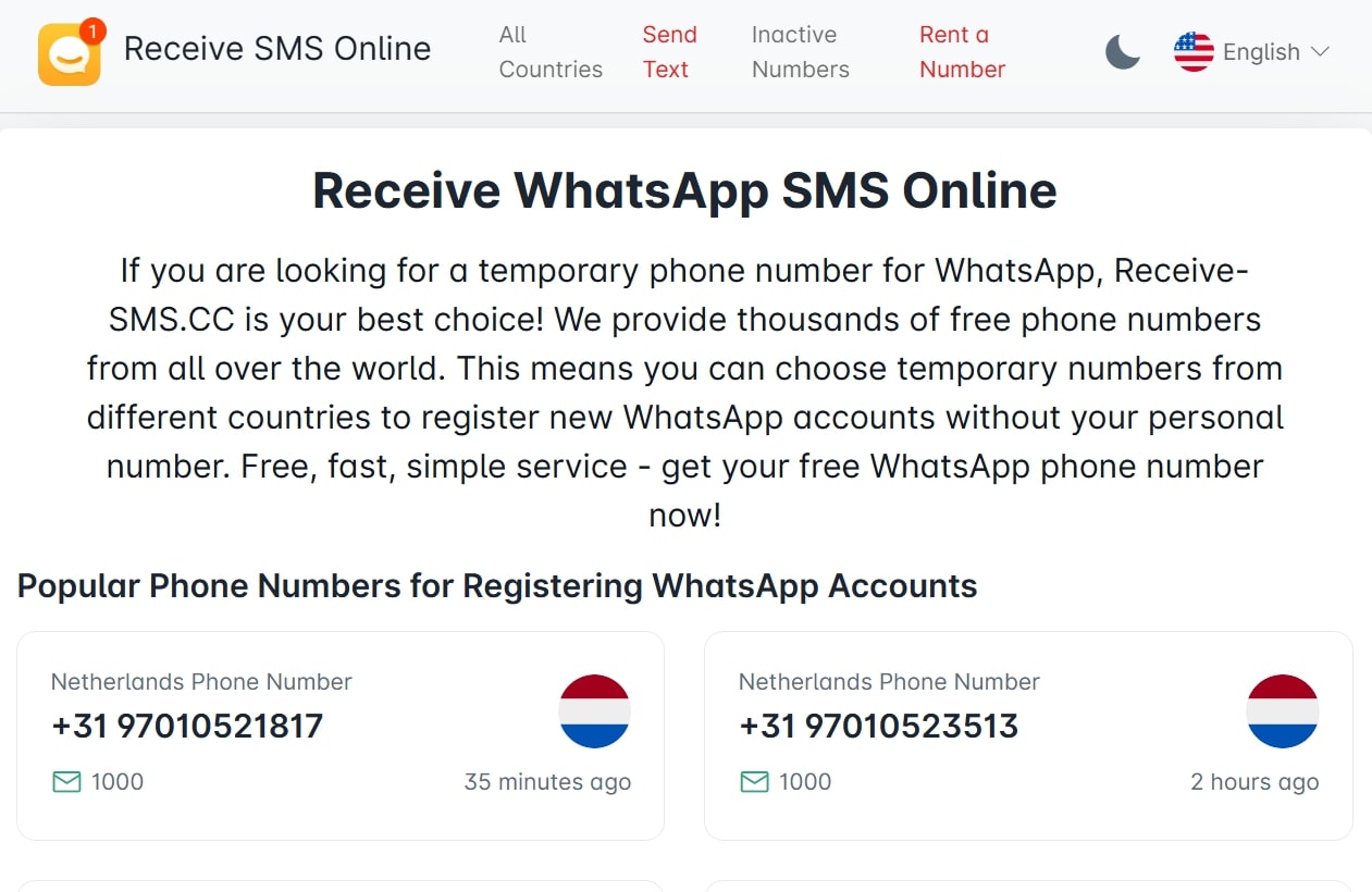 操作說明。首先,通過您的電子郵件地址在此網站上註冊,然後只需 0.05 美元即可購買您想要使用的號碼。此後,每當 WhatsApp 向您的虛擬號碼發送代碼時,您都會在您網站的個人資料中收到該代碼。