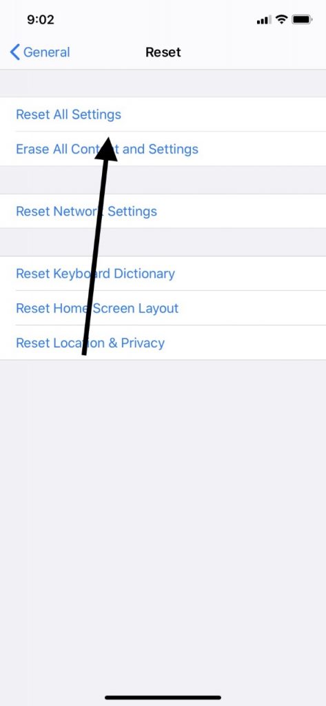 打開設定並擊中一般的。前往重置, 然後重置所有設置。一旦你點擊重置所有設置,您應該會看到您的設備關閉、重置,然後重新打開。這應該需要一些時間,所以請耐心等待。
