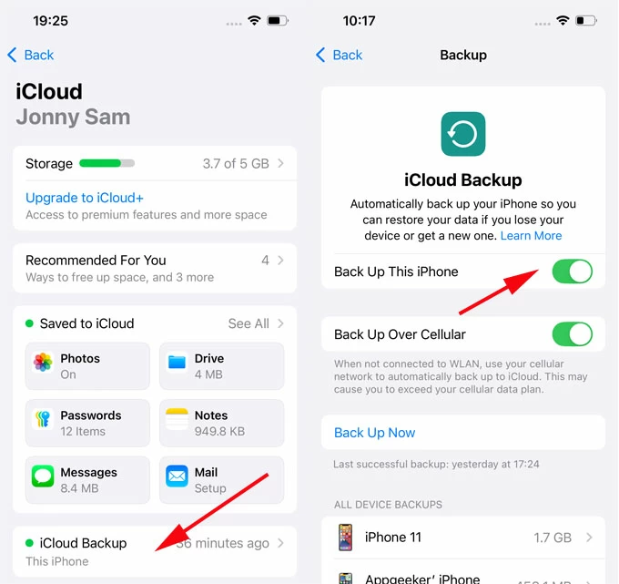 為了備份iPhone短信和其他所有內容,您可以通過設置>您的名字> iCloud> iCloud備份>自動備份;或通過iTunes或Finder手動用計算機手動備份iPhone。