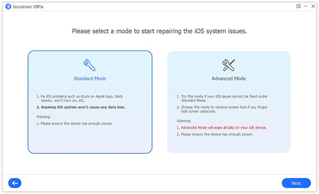 JoyoShare UltFix 軟件非常人性化。啟動軟件後,它會立即提示您將 iOS 設備與計算機連接。您可以選擇標準模式(修復 iOS 問題而不丟失數據)或高級模式(將刪除您的數據)。