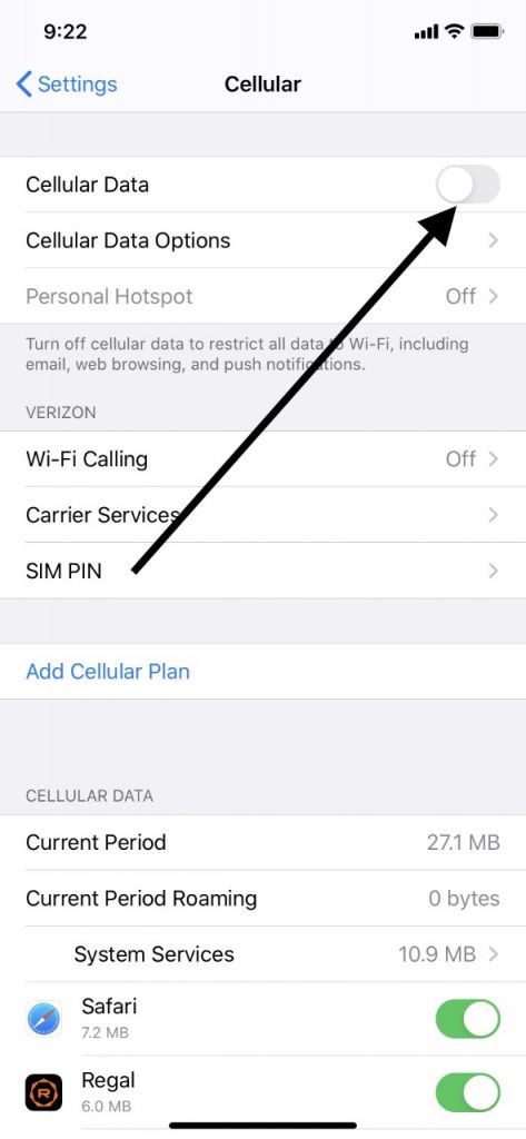 如果您在iPad上使用蜂窩服務來嘗試與iTunes連接,請確保已打開iTunes商店的蜂窩數據。去設定, 然後細胞,打開蜂窩數據通過將開關切換到右側。如果它變成綠色,那麼您已經正確完成了。
