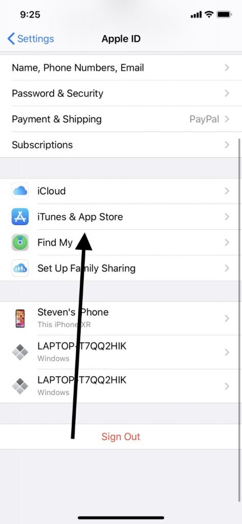 下一個修復程序將是簽署,然後如果您最近更改了Apple ID或密碼,則返回。去設定,然後點擊你的照片。去iTunes和App Store。點擊你Apple ID並簽約。然後,點擊登入再次提示時輸入密碼。