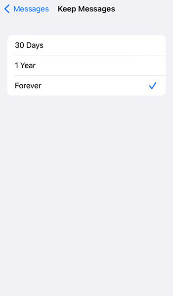 ⚙️錯誤的設置– 大多數 iPhone 用戶甚至不知道 iPhone 設置可以在一定時間後刪除您的消息。它可能已設置為在 30 天或一年後刪除郵件,而不是永久保留郵件。