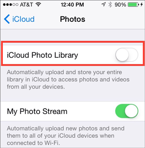 - 關閉“我的照片流”和“iCloud 照片共享”選項。