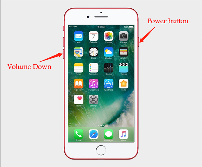 - 對於iPhone 7/7 Plus:同時按並按住“電源”按鈕和“音量降低”按鈕8至10秒鐘,直到出現Apple徽標為止。