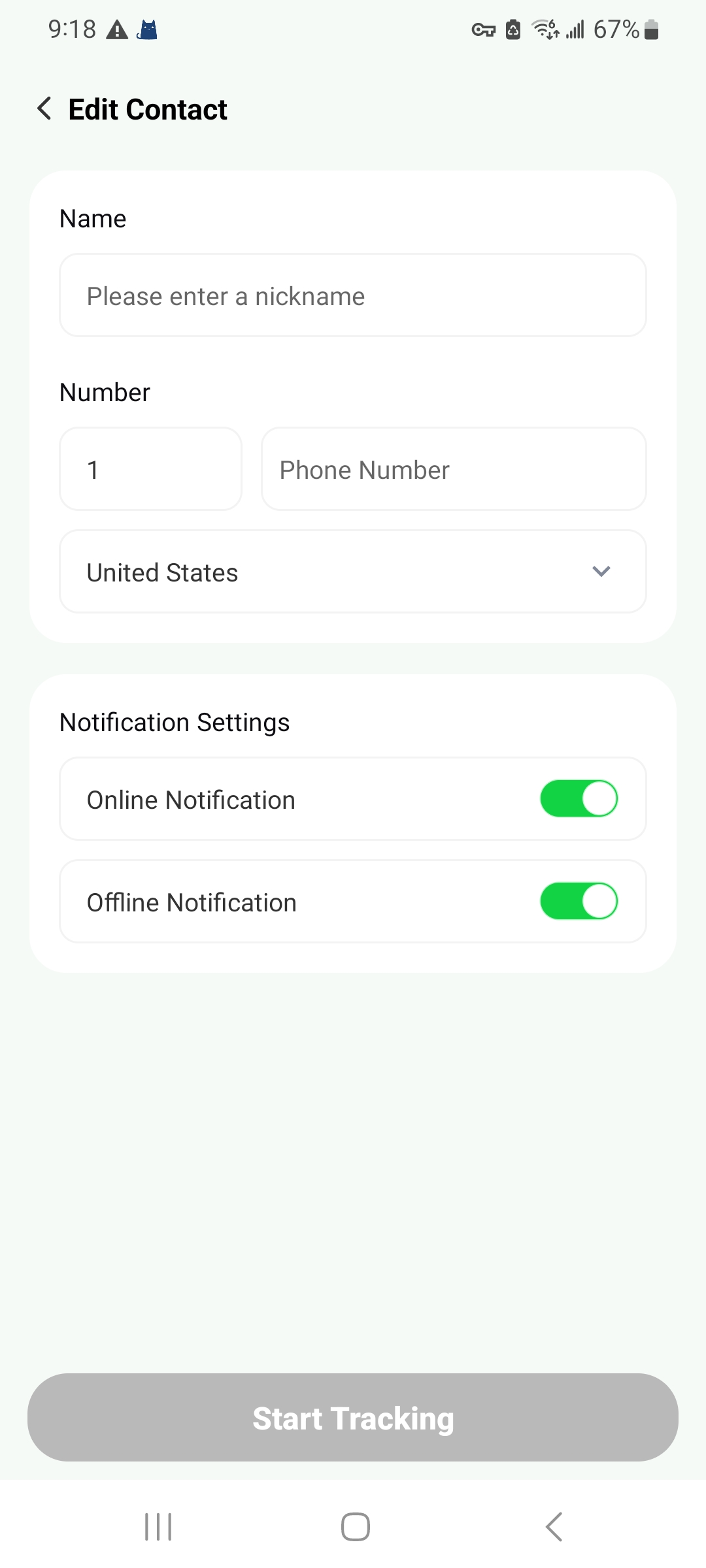 首先,打開應用程序並輸入您要跟踪的人的詳細信息,包括姓名、電話號碼和地區。之後,根據要求打開“在線提醒”和“離線提醒”選項。完成後,導航至屏幕底部的“開始跟踪”按鈕以繼續。