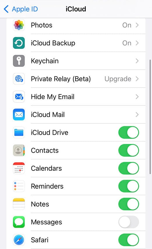 - 選擇 ”iCloud”並關閉開關以“聯繫人“。