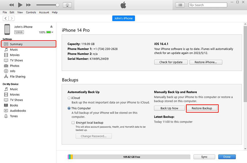 - 單擊iTunes中的設備圖標,然後導航到摘要>還原備份。