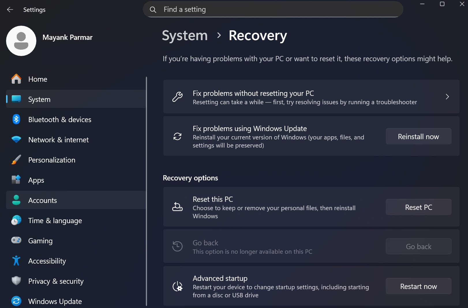 在“設置”>“系統”>“恢復”中,您會遇到各種恢復選項,包括“重置此電腦”,該選項自 Windows 8 天以來就沒有任何變化。