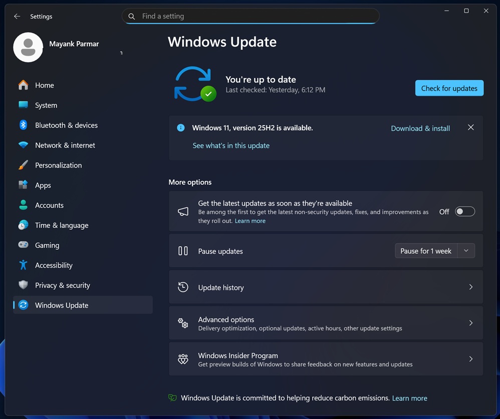 在我的一台設備上,即使關閉獲取最新更新的開關,我現在也可以看到 Windows 11 版本 25H2。這證實了更新的更廣泛推廣。我向微軟詢問了詳細信息,它告訴我,它現在正在向更多人播種 Windows 11 25H2,但除非你打開開關,否則更新不會自行下載或安裝。