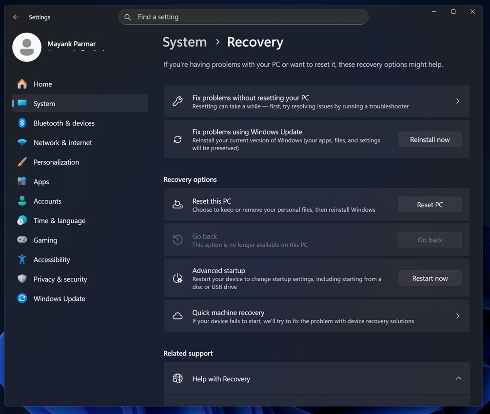 當 Windows 遇到障礙時,您可以進入 WinRE,或者從設定>系統>恢復,然後選擇“立即重新啟動”在高級啟動下。