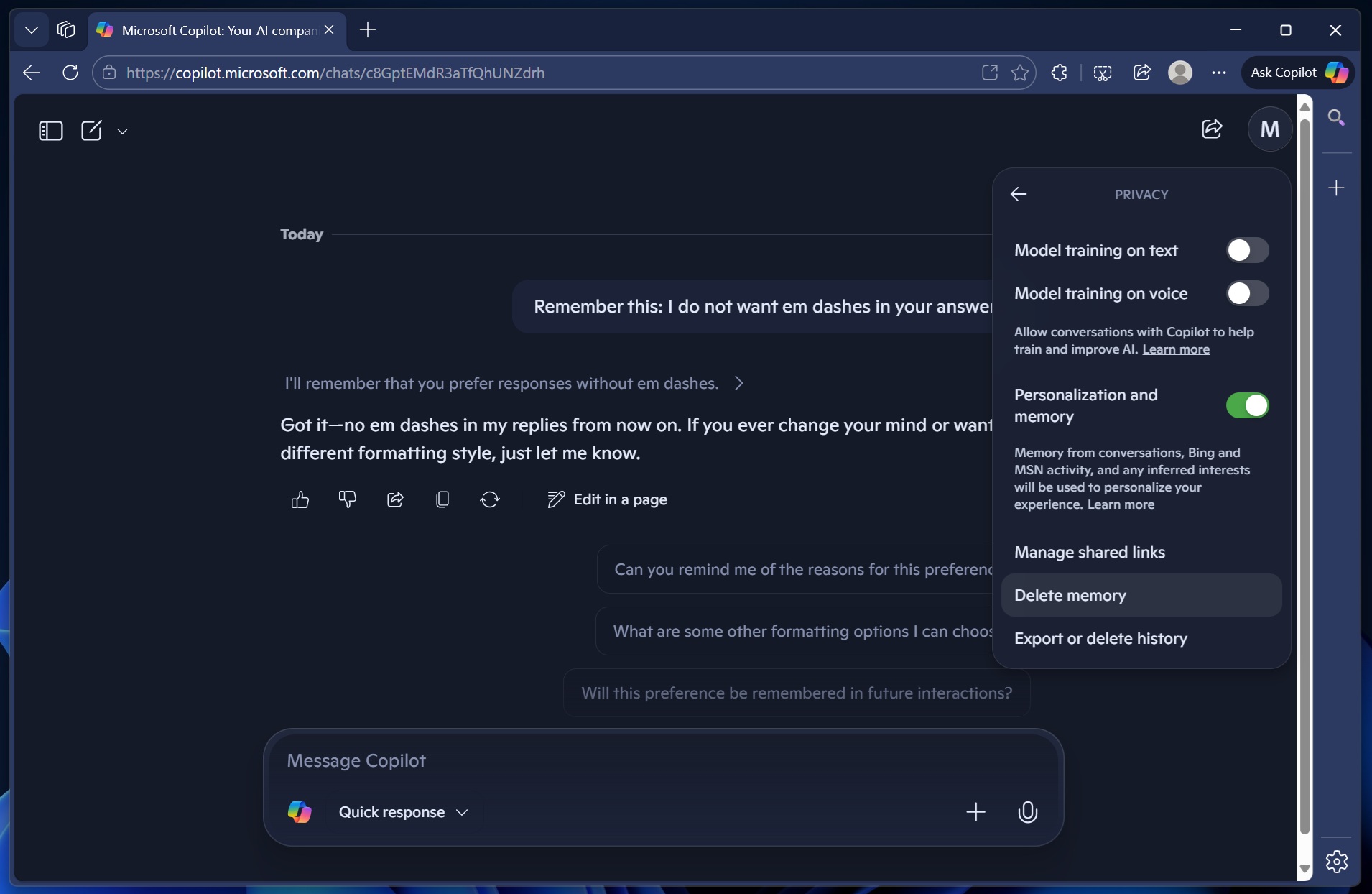 目前,它並不能讓你真正管理 Copilot 對你的了解,但它清楚地表明,如果你明確告訴 Copilot “記住這一點”,它就會遵循指示。您只是看不到 Copilot 上保存的記憶。但如果您前往“隱私”部分,則可以刪除所有保存的記憶。