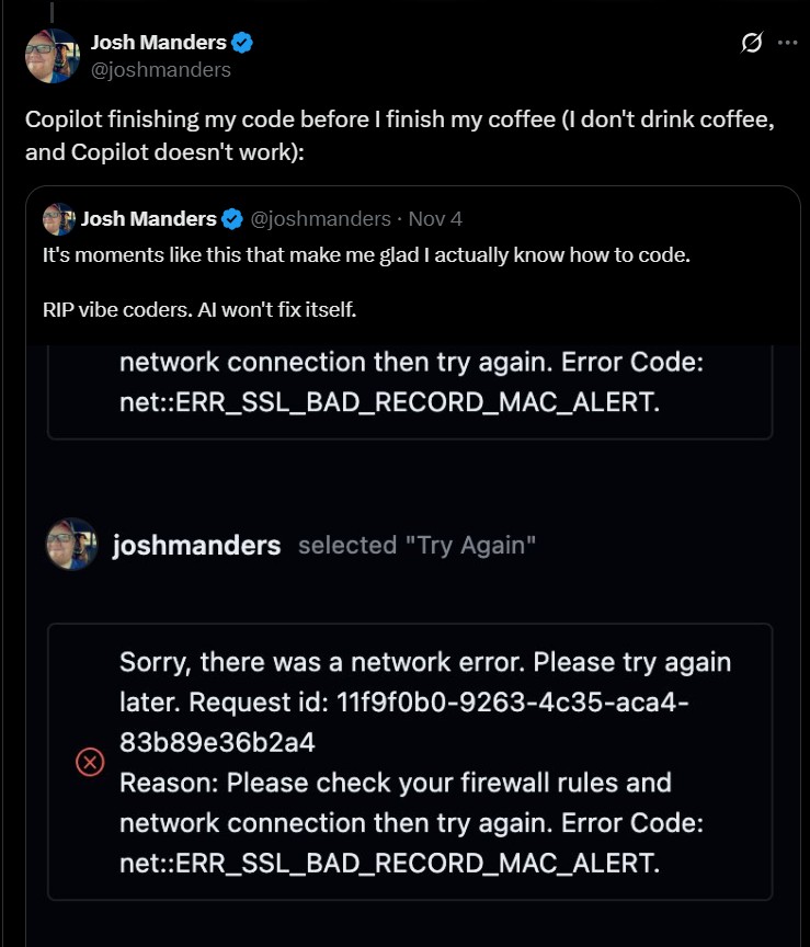 微軟試圖在 X 上發布一篇該公司認為是詼諧的帖子來吸引開發人員,內容是“副駕駛在喝完咖啡之前先完成你的代碼”。但真正的開發者並沒有袖手旁觀,而是在評論中對 Windows 11 進行了惡搞。