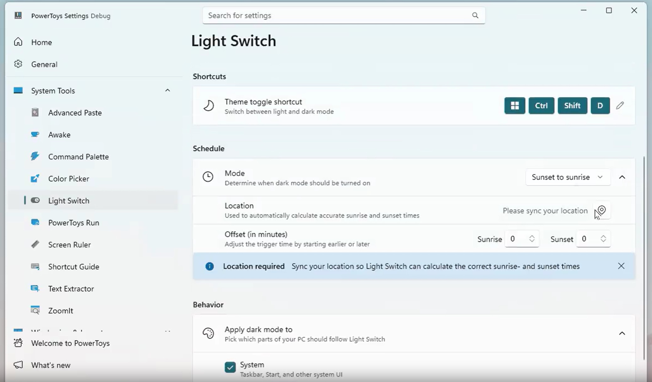 即將推出的 PowerToys 功能從調度的角度接近這一點。就像系統上的夜燈模式一樣,您可以啟用並選擇“手動”或“日落到日出”模式。您還可以設置該模式生效的位置,並定義一個偏移時間來延遲或加快自動調度。
