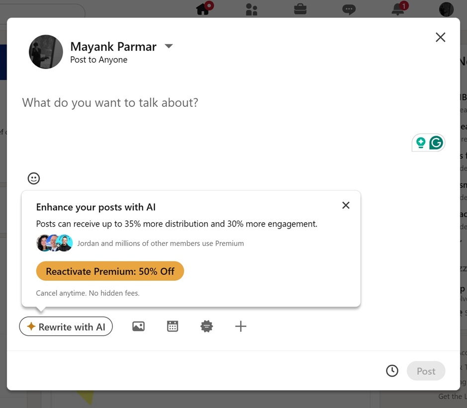 例如,無論您如何使用 LinkedIn,如果您嘗試發布任何內容,系統可能會提示您使用其“Rewrite with AI”。請記住,LinkedIn 使用 Microsoft 託管的 OpenAI 模型來實現其 AI 功能。