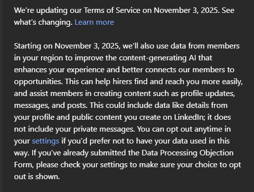 “從 2025 年 11 月 3 日開始,我們還將使用您所在地區會員的數據來改進內容生成人工智能,從而增強您的體驗並更好地將我們的會員與機會聯繫起來,”LinkedIn 在 Windows Latest 發現的一封電子郵件中指出。