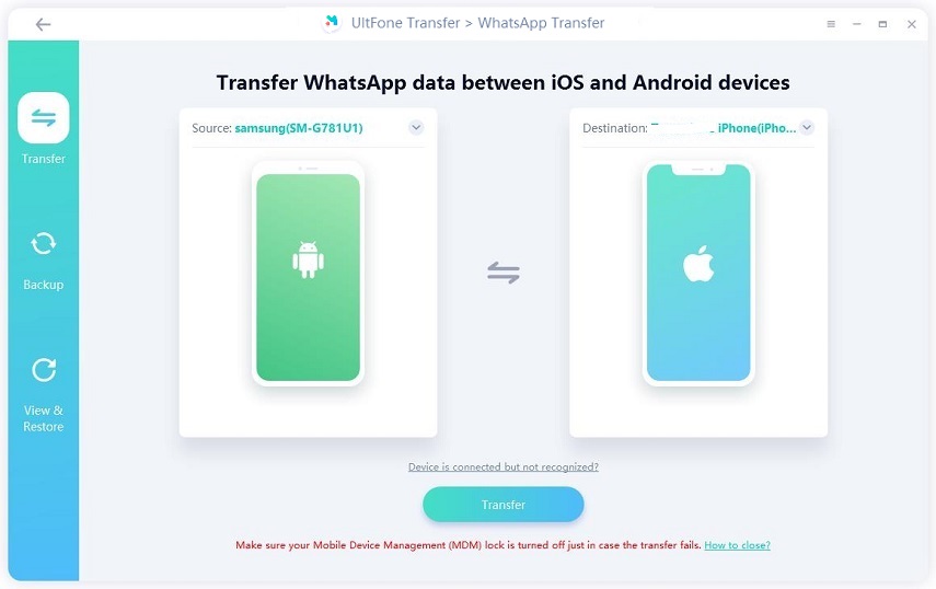 步驟1在您的計算機上安裝 UltFone WhatsApp Transfer 軟件,然後連接要與該計算機共享數據的兩個設備(Android 和 iPhone)。您可以通過 USB 電纜連接來實現此目的。然後,選擇文件並單擊“傳輸”。