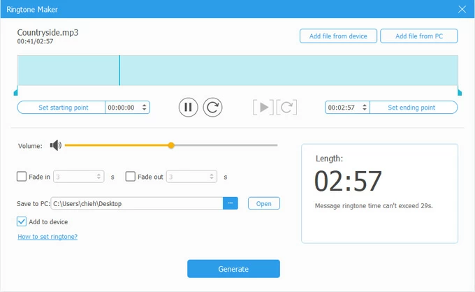這是使用PC/ Mac的iPhone Data Transfer從沒有iTunes或GarageBand的歌曲中創建自定義鈴聲的方法。