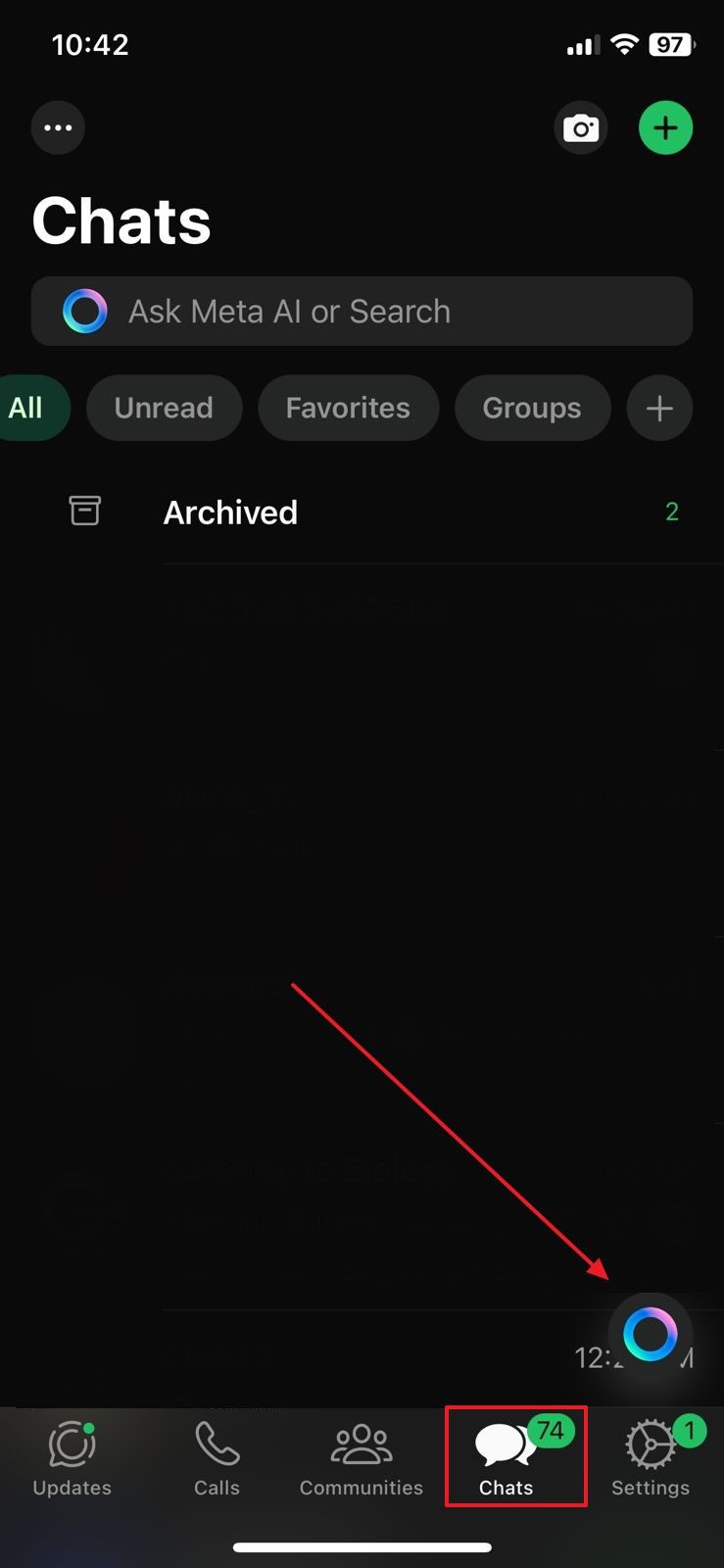 步驟1在您的 iPhone 設備上啟動最新版本的 WhatsApp,然後找到應用程序的“聊天”部分。在屏幕右下角,點擊代表 Meta AI 聊天機器人的小球體圖標。今後,您可以使用 WhatsApp 的集成 AI 助手進行聊天。