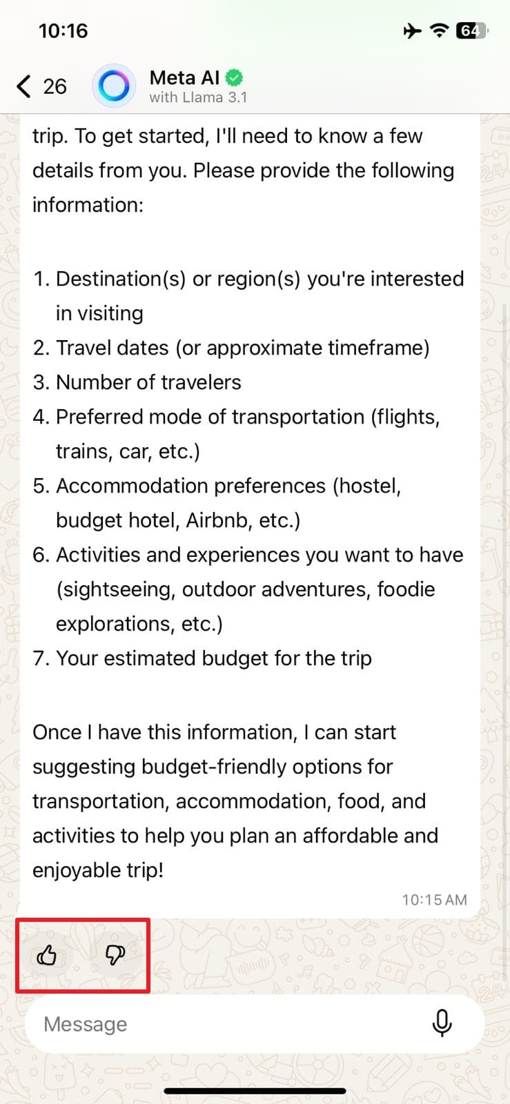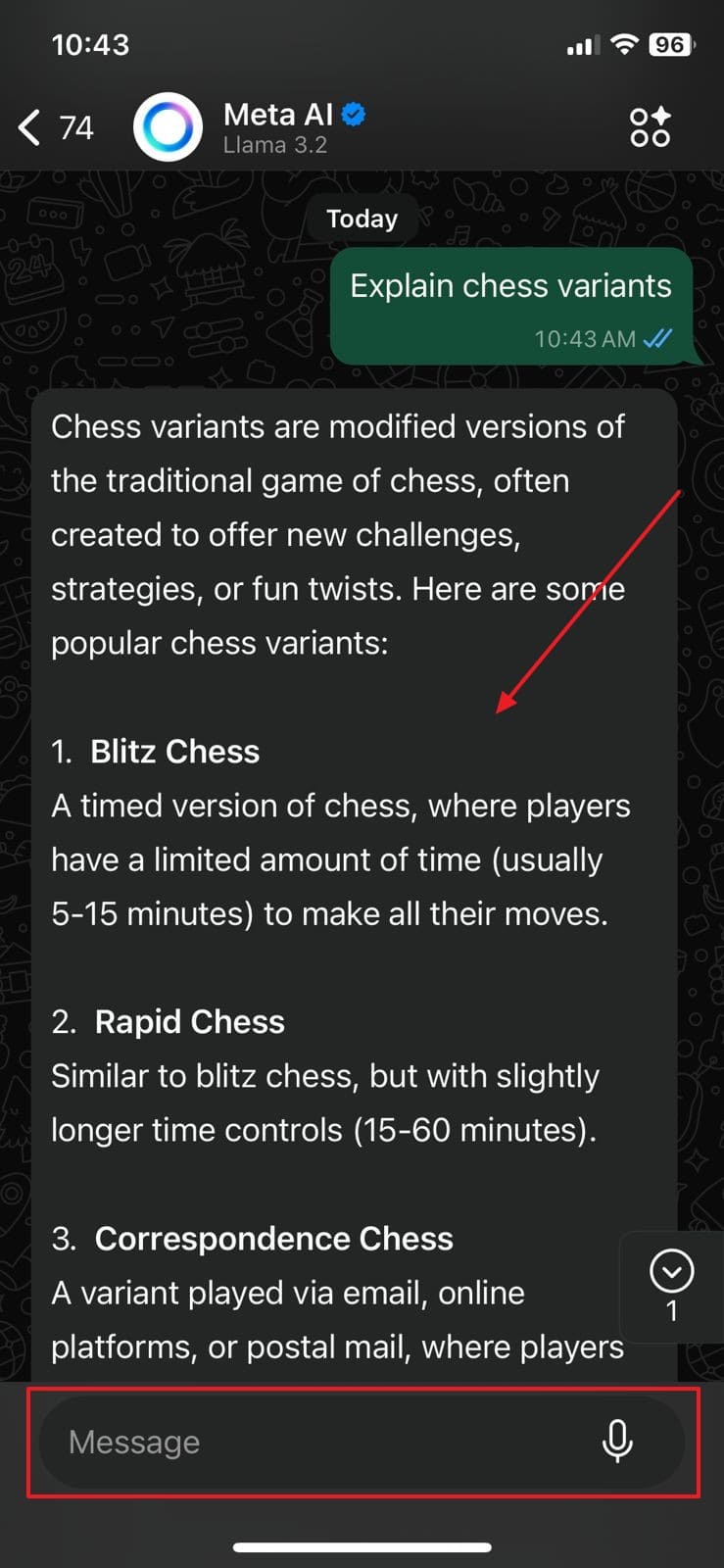 步驟2在 Meta AI 聊天界面中,在“消息”框中輸入消息提示,即可獲得自動即時回复。
