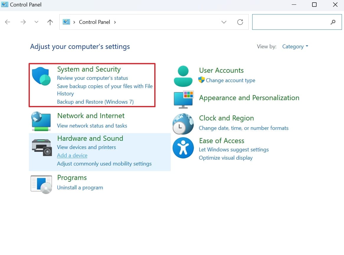 步驟1利用 Windows 搜索欄查找“控制面板”並從結果中啟動它。接下來,轉到“系統和安全”選項卡,然後單擊“備份和還原(Windows 7)”選項。