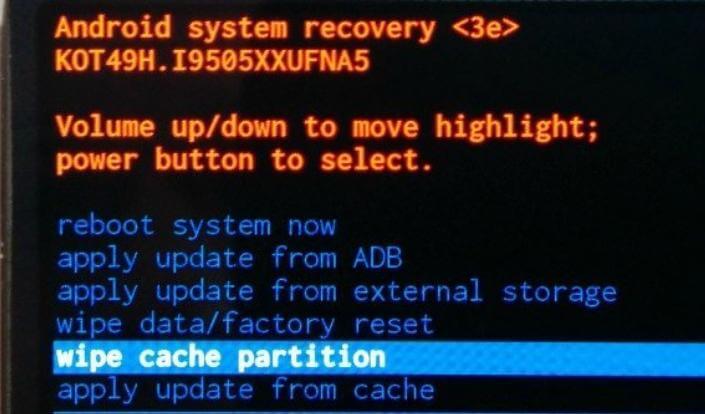 按“電源”、“主頁”和“音量減小”鍵 -> 選擇“擦除緩存分區”選項。該過程完成後,系統將自動重新啟動。