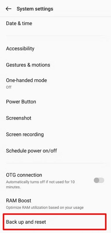 步驟1首先進入 OnePlus“設置”並進入“系統設置”選項。然後,向上滑動並選擇底部的“備份和重置”選項。