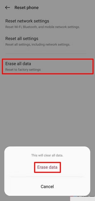 步驟2接下來,點擊“重置手機”頁面中的“刪除所有數據”選項,系統將提示您進行確認。最後,點擊彈出上下文菜單中的“擦除數據”按鈕以啟動該過程。