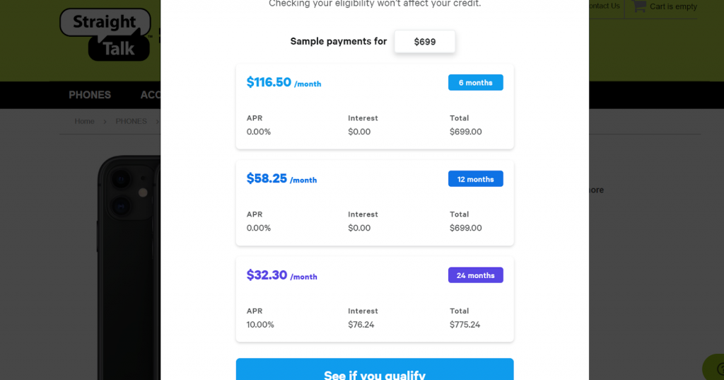 Straight Talk 在其銷售的大多數手機上提供電話分期付款計劃。如果您在一年內支付手機費用,則無需支付利息。兩年以上,通常費用約為10%。 Straight 也不需要信用檢查。