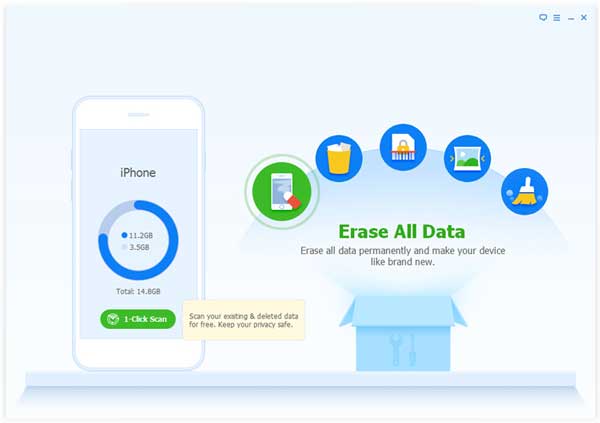 啟動該工具並等待您的 iPhone 被檢測到。接下來,選擇您的設備並選擇您需要的刪除選項 - 擦除所有數據。