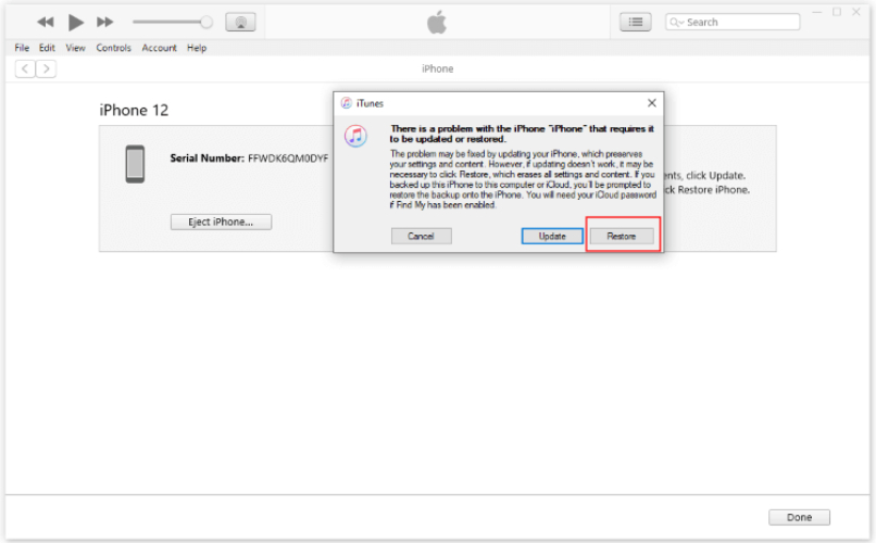 - 一旦您的 iPhone 進入恢復模式,iTunes 就會檢測到它。單擊恢復按鈕開始恢復您的 iPhone。
