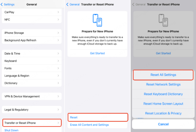如果你的iPhone 17 開機循環或者iPhone 17 Pro 卡在啟動循環中發生這種情況時,重置所有設置可能有助於解決問題,而無需刪除您的個人數據。此過程僅將 Wi-Fi、藍牙和顯示設置等系統首選項恢復為默認值,這可以修復導致啟動循環的故障。