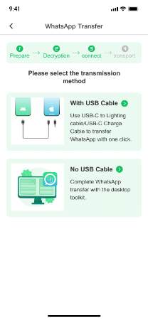 步驟3然後,輸入生成的密鑰或上傳其屏幕截圖並選擇“USB 電纜”方法以實現更快的傳輸。一旦您用 USB 連接兩部手機,WatsGo 將以極快的速度完成 WhatsApp 傳輸過程。