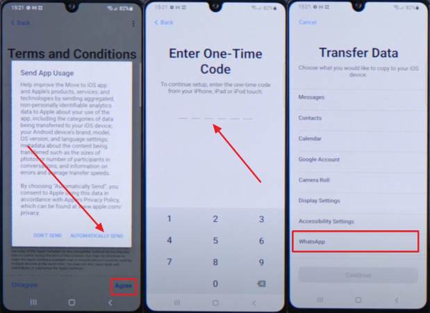 步驟2現在,下載該應用程序並在 Android 手機上啟動它,點擊“同意”選項接受條款和條件。接下來,按彈出菜單中的“自動發送”選項,輸入您在 iPhone 上獲得的代碼。完成後,從“傳輸數據”屏幕激活“WhatsApp”選項並繼續。