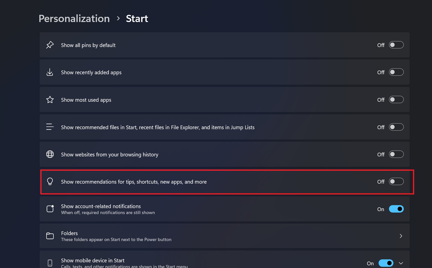 您可以關閉“顯示提示、快捷方式、新應用程序等的推薦” 切換到設定>個性化>開始從 Windows 11 開始菜單中完全刪除推薦源。此功能最終向測試人員推出(需要版本 26120.4250或更新版本),但它將在接下來的幾週內到達每個人。