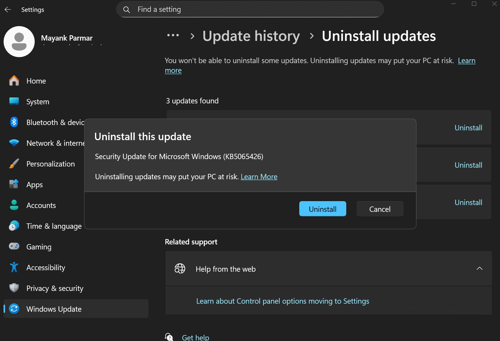 如果您受到影響,您可以打開設定>Windows更新>更新歷史>卸載更新,然後選擇Windows 11 KB5065426進行卸載。 Windows 將警告您將刪除安全補丁。當您確信您的電腦在 9 月份開始出現問題時,您可以繼續。