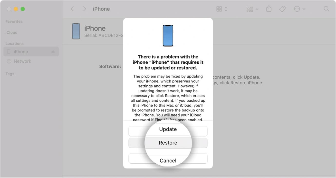 步驟2:按住恢復模式指南中的最後一個按鈕,然後使用 USB 線將已禁用的 iPhone 連接到電腦。 iTunes 錯誤地檢測到您的設備並提供恢復或更新。恢復繼續。
