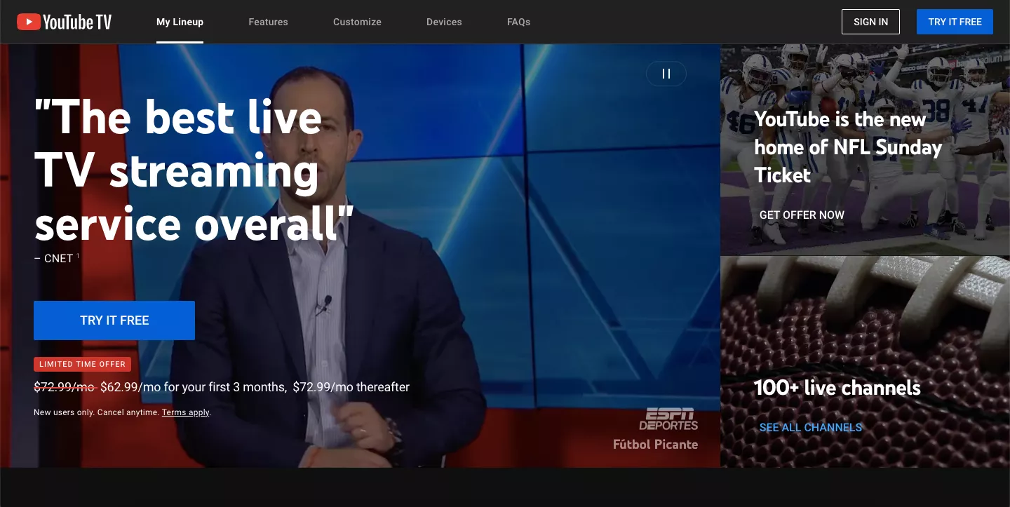 Youtube 電視可能不會立即與在線足球直播聯繫在一起。但該服務的美國付費版本確實包括許多體育頻道,包括福克斯足球Plus。因此,您可以在這個網站上觀看UCL、歐羅巴聯賽、德甲、中北美洲及加勒比海冠軍聯賽和足總杯。但請不要混淆 YouTube TV 和 YouTube Premium - 這是兩種不同的服務,而且 YouTube TV 本身並不是沒有廣告的。