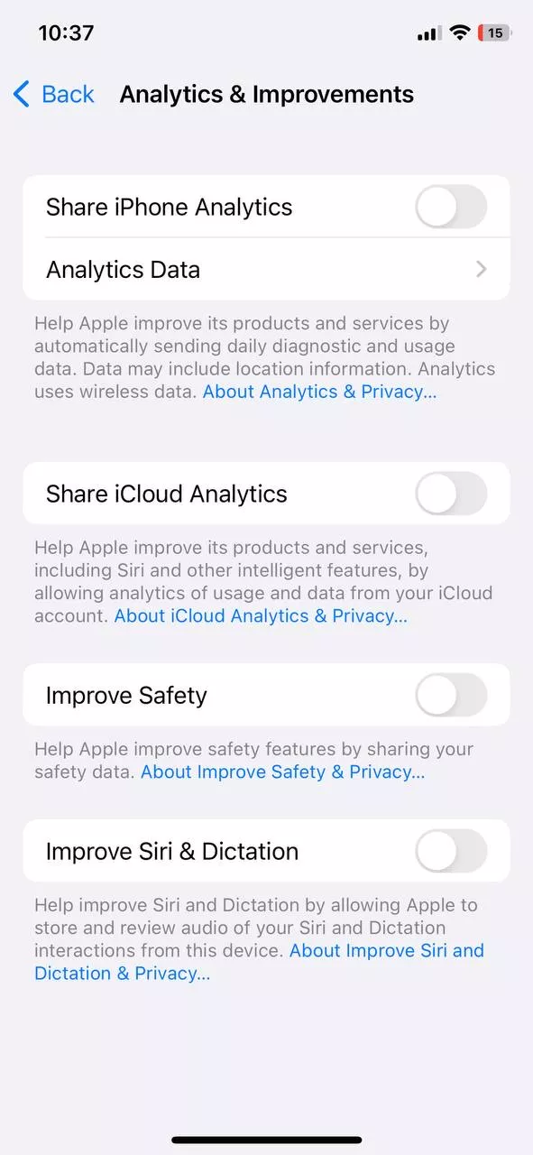 - 關閉不需要的監控(包括分享 iPhone 分析,與應用程序開發人員分享,改進 Siri 和聽寫,等等)。