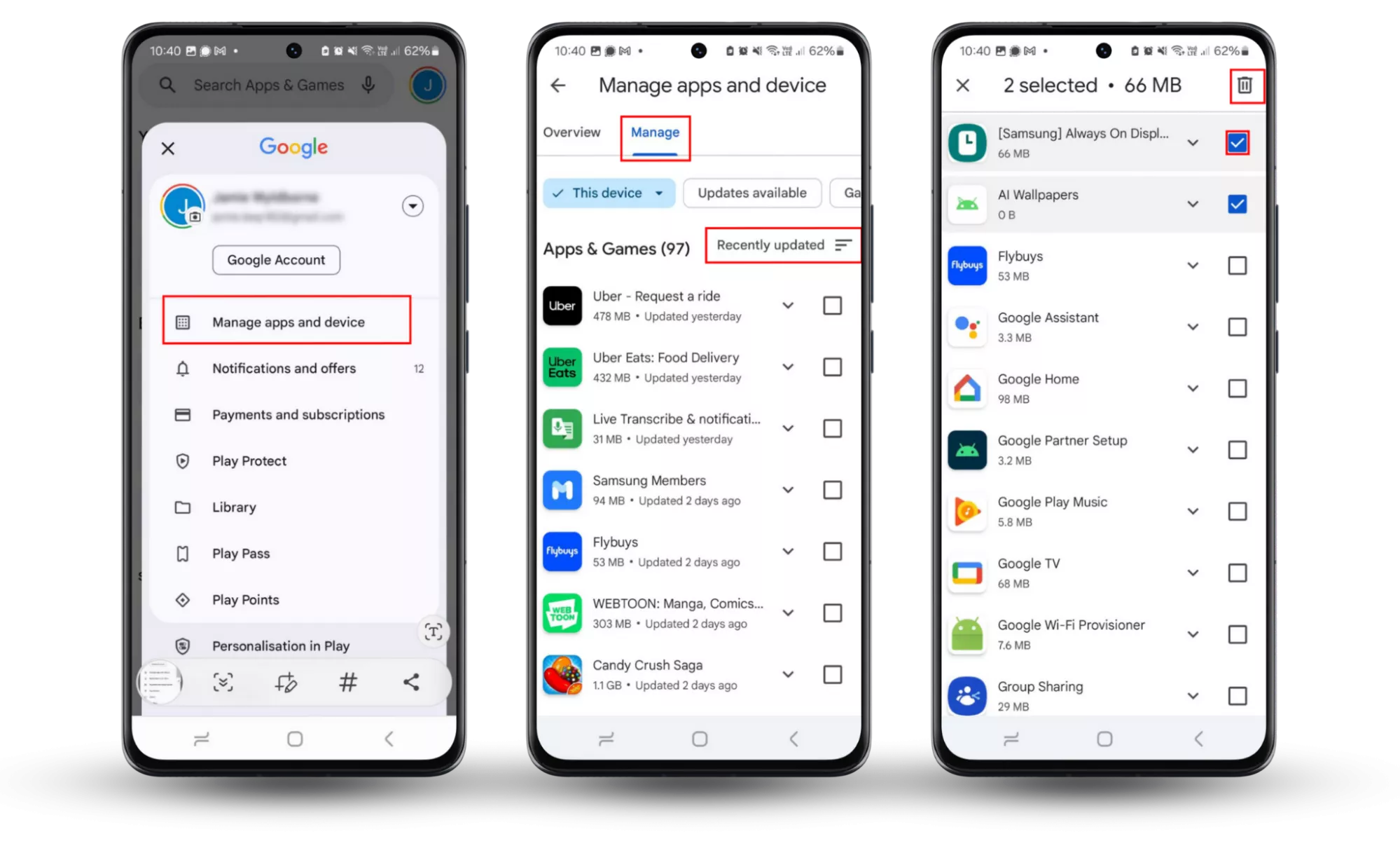 步驟 1-7:Google Play 商店 > 個人資料圖標 > 管理應用程序和設備 > 管理 > 選擇應用程序 > 刪除。
