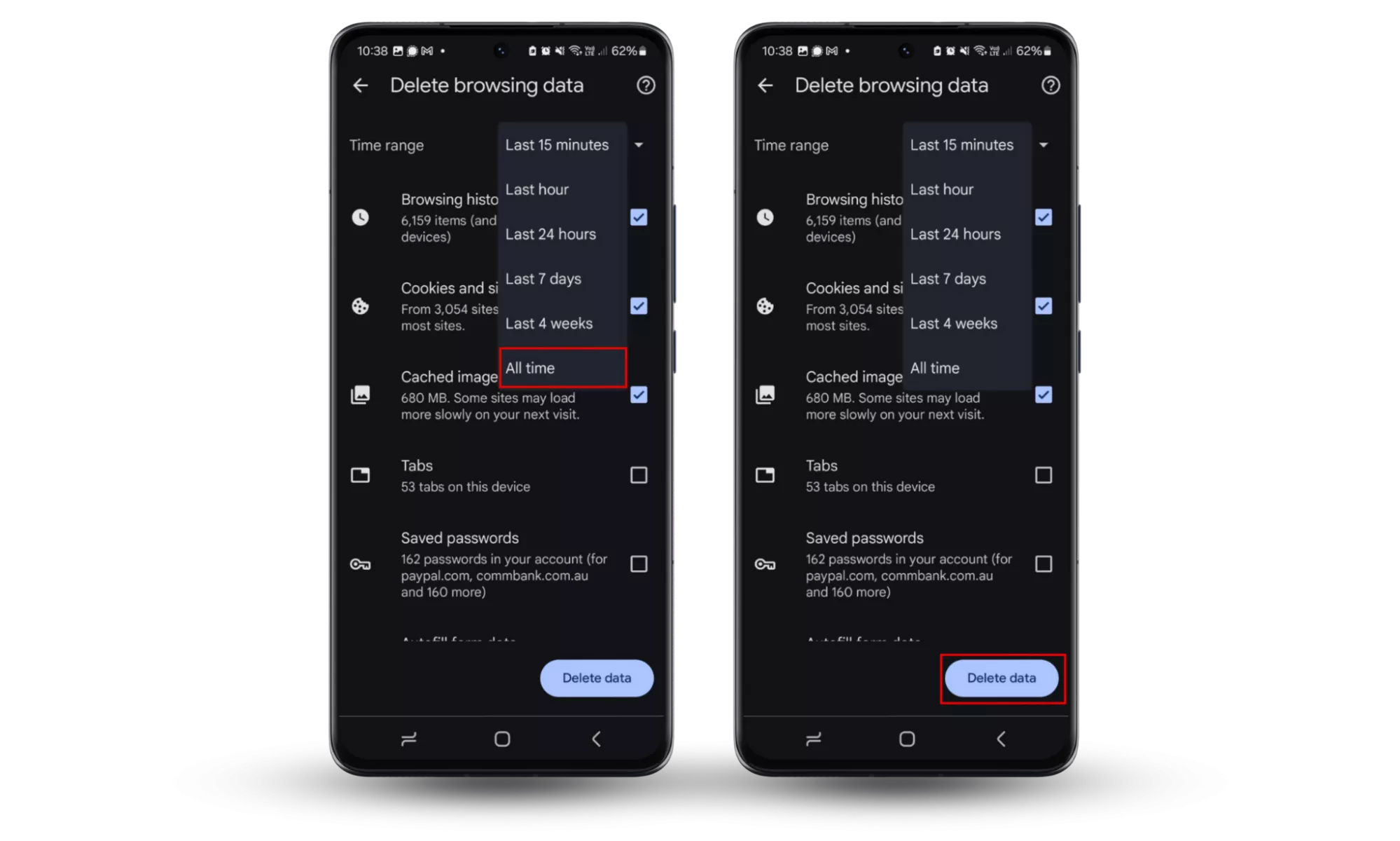 步驟 5-6:選擇時間範圍,然後按刪除數據。