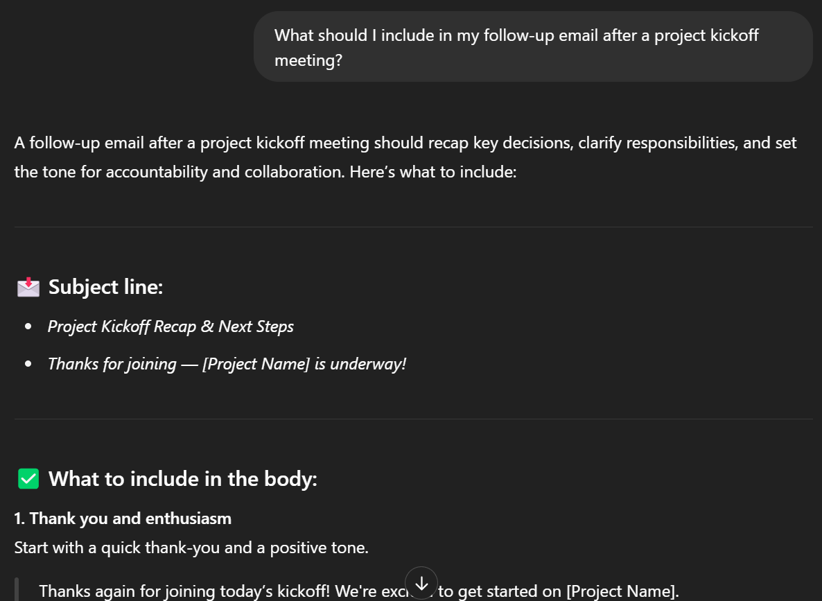 無論您是要確認細節、推動潛在客戶,還是只是說“感謝您參加會議”,適時的跟進都可以保持勢頭。借助 ChatGPT 等工具,您不必每次都從頭開始。您可以更快地編寫電子郵件,聽起來更優雅,並保持工作流程順利進行,尤其是在會議、電話和內部簽到之後。