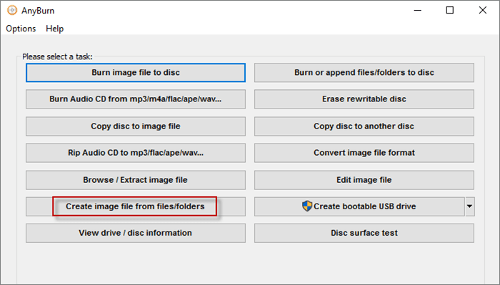 第 1 步:運行 AnyBurn 並選擇從文件/文件夾創建圖像文件選項。
