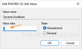 - 將其價值數據從1更改為0,以使Windows 11始終顯示滾動條,請單擊好的。