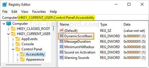 HKEY_CURRENT_USER\Control Panel\Accessibility。在右邊,雙擊32位DWORD值DynamicsCrollbars。