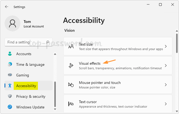 - 按WIN + I鍵盤組合啟動設置應用程序。選擇可訪問性從左導航窗格中,然後單擊視覺效果在右側。