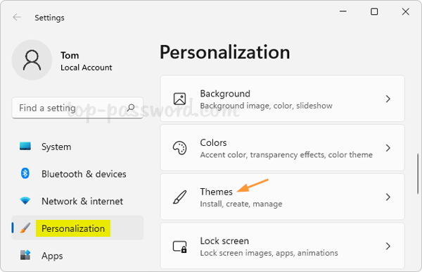- 當“設置”應用程序打開“個性化”頁面時,單擊主題在右側窗格中。